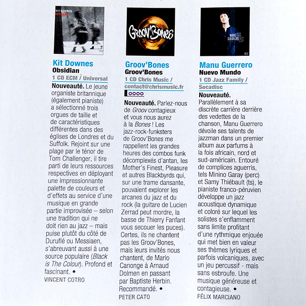 Ce mois-ci, les rédacteurs de Jazz Magazine ont aussi écouté et apprécié les albums de Groov’Bones et du quintet emmené par Mario Canonge et Michel Zenino. Quatre étoiles méritées pour chacun d’eux. Sous les plumes respectives de Peter Cato et Pascal Rozat, voici ce qu’ils en disent.