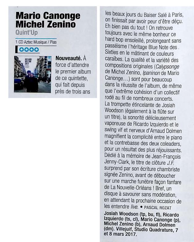 Mario Canonge et Michel Zenino / Quint’Up : “On retrouve toujours avec le même bonheur ce hard bop ensoleillé, prolongeant sans passéisme l’héritage Blue Note des Sixties en le mâtinant de couleurs caraïbes.” – Pascal Rozat