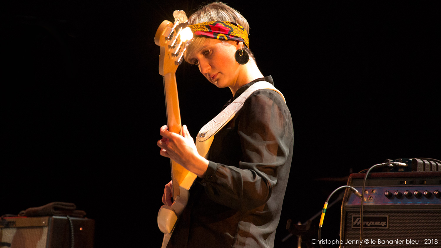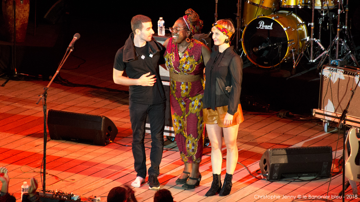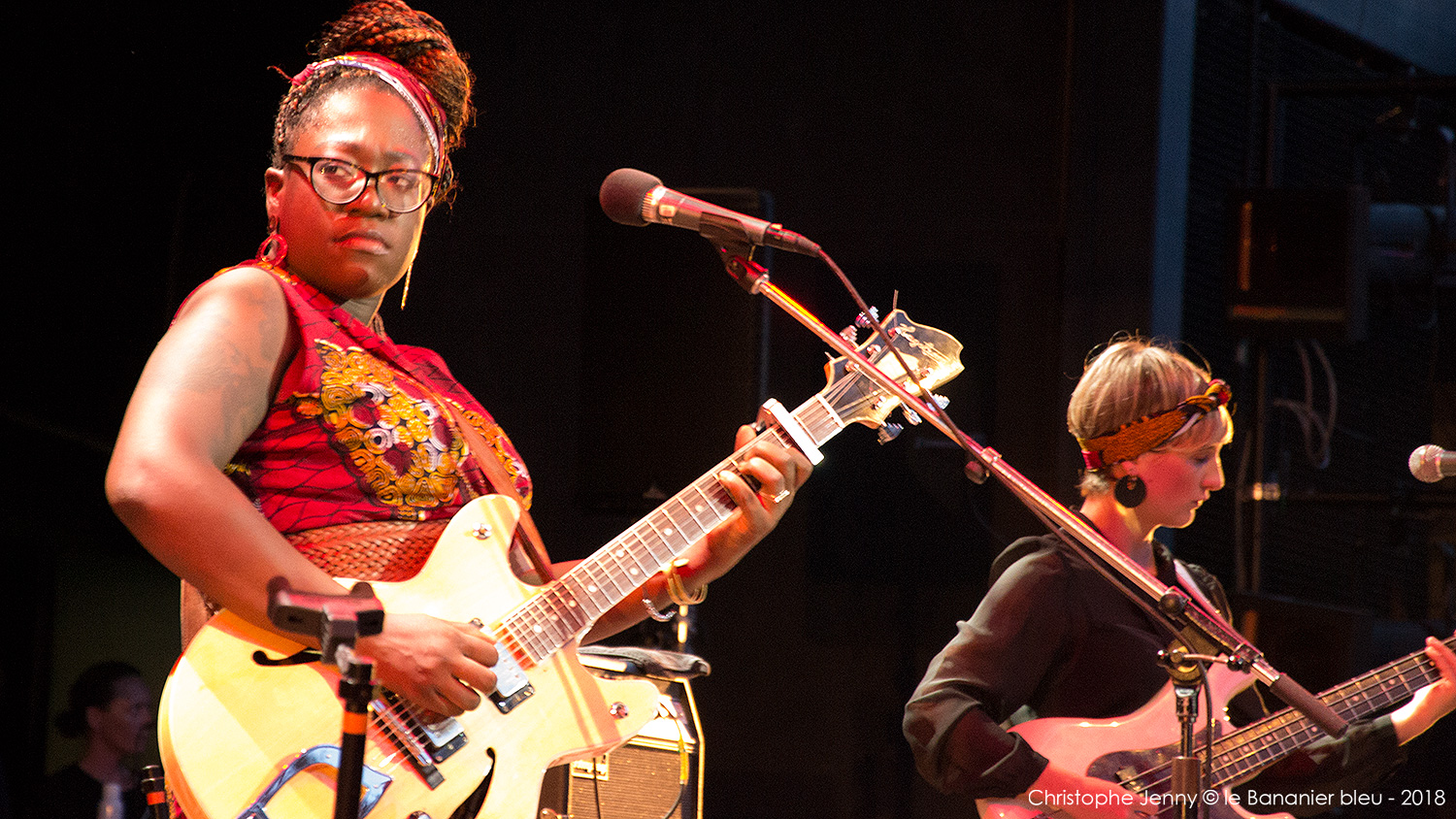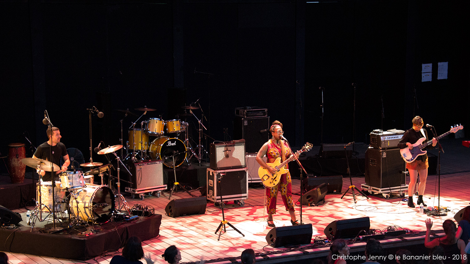 Cela faisait déjà quelques mois que j’attendais (impatiemment) l’occasion d’écouter Mélissa Laveaux. La chanteuse haïtienne est précédée d’une réputation qui grandit à vue d’œil ces derniers temps, et il était donc urgent de faire quelque chose. L’occasion vient de se présenter lors du concert de clôture du Festival Radio France Occitanie Montpellier 2018, et de la soirée FIP dont la tête d’affiche était Seun Kuti. Mais pour débuter la soirée, c’est Mélissa Laveaux qui ouvrait le bal sur la scène de l’amphithéâtre d’O. Pour l’occasion, l’avant-scène avait été démonté pour laisser place à la piscine, rapidement envahie par les danseurs. Et c’est en trio, guitare en bandoulière, que Mélissa Laveaux a donné le feu vert, accompagnée d’Élise Blanchard (b) et Martin Wangermée (dms). Je m’étais imposé de ne rien écouter au préalable pour laisser la surprise opérer. Objectif pleinement atteint avec ce bouillonnant folk rock caribéen qui déborde d’énergie. Mélissa chante en créole ses racines haïtiennes, mélange rythmes vaudous et rock, et invente une nouvelle déclinaison de la mizik rasin. Son chant peut être doux mais aussi puissant lorsqu’il faut dénoncer les injustices et les souffrances. « Les chanteuses haïtiennes sont rock cette année, parce qu’elles sont en colère, et qu’elles ont des choses à dire » me confie Mélissa, en clin d’œil au dernier album de Moonlight Benjamin dont nous avons récemment parlé ici. Sur scène, Mélissa reprend le répertoire de son dernier album, Radyo Siwèl, sorti chez No Format en début d’année. C’est une musique de combat, porteuse d’énergie positive et d’espoir, sous l’aile protectrice de Papa Legba. Et un disque à se procurer sans hésiter ! Ah, et au fait, Mélissa Laveaux et Moonlight Benjamin sont programmées toutes les deux ce dimanche au WOMAD UK. Au cas où…