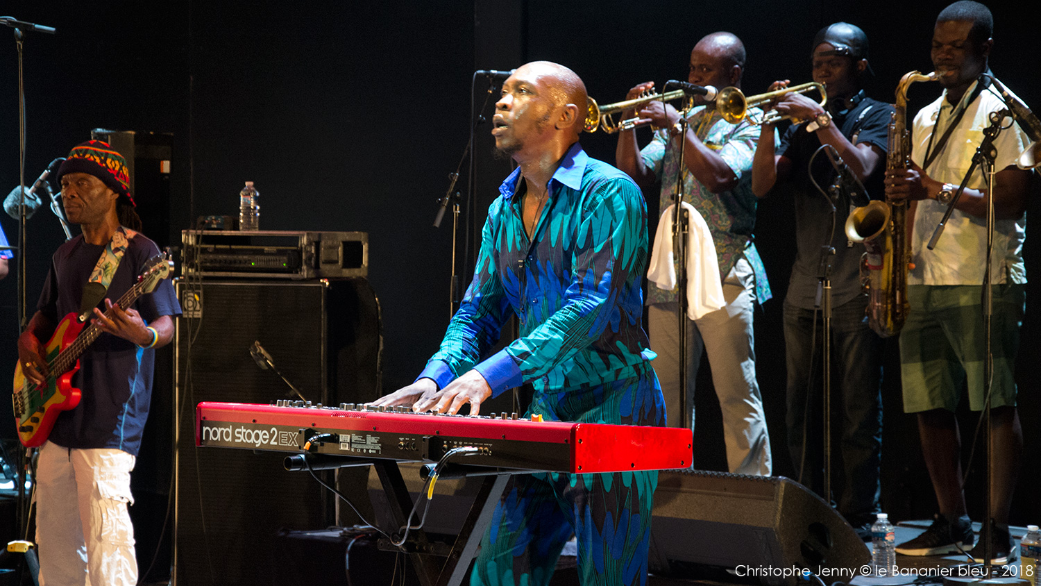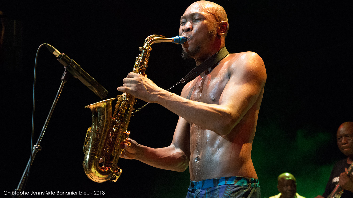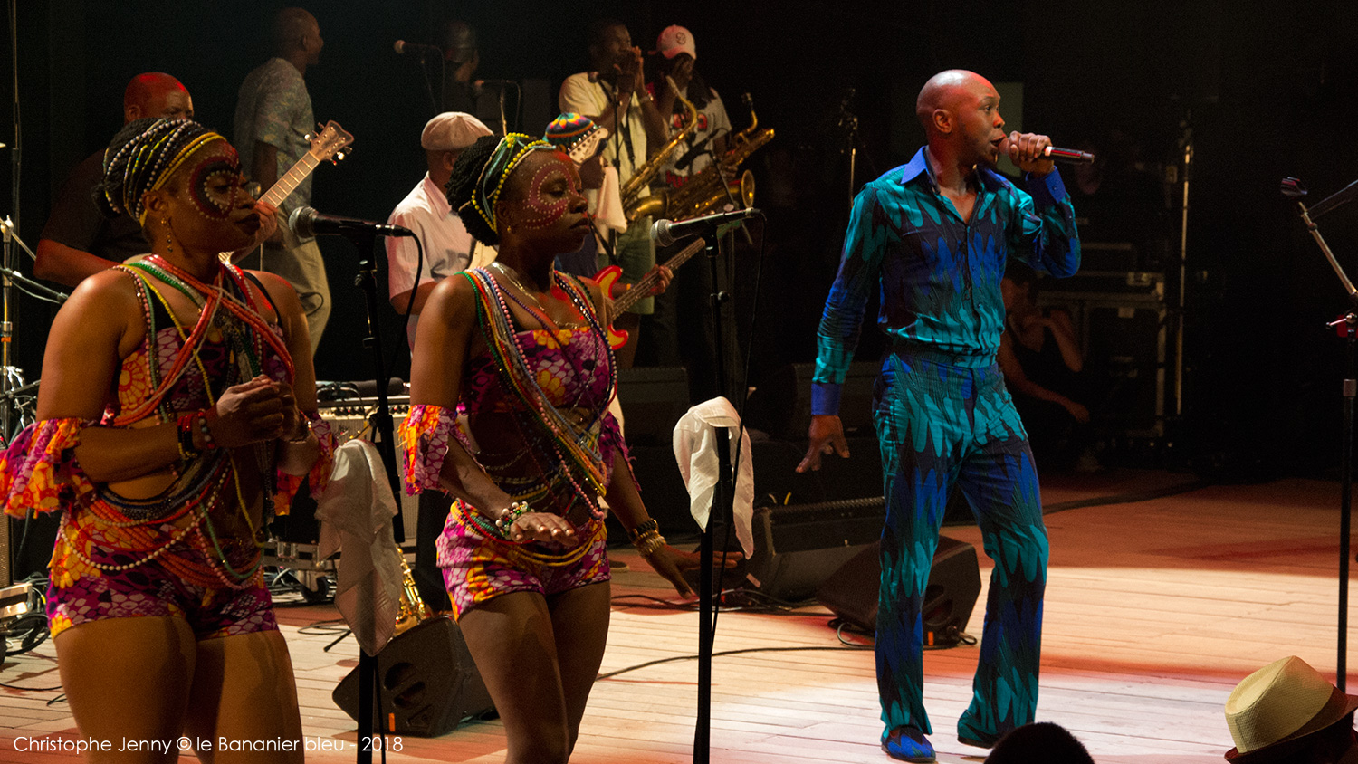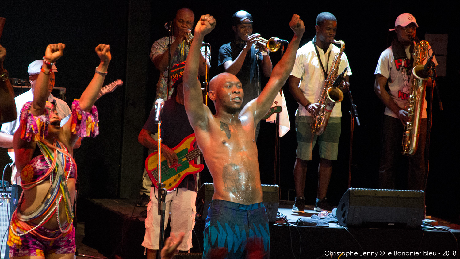 En clôture du Festival Radio France Occitanie Montpellier 2018, la soirée FIP s’achevait ce 27 juillet, avec le concert évènement de Seun Kuti & Egypt 80. Le plus jeune fils de Fela a pris possession de la scène avec les treize membres de l’orchestre mythique de son père, après un premier set de la chanteuse haïtienne Mélissa Laveaux qui avait donné le ton une heure plus tôt. Débauche d’afrobeat dès les premières notes, section de cuivres au millimètre, choristes danseuses inépuisables, le spectacle ravira le public déchainé pendant les deux heures à suivre. Seun Kuti vient présenter son dernier album, Black Times, sorti cette année chez Strut Records. Les messages politiques sont omniprésents, pour remettre l’Afrique au centre et s’indigner de l’absurdité du monde actuel. Seun Kuti fait le show, dirige à la baguette une formation à la précision chirurgicale, alterne le chant, le saxophone et le clavier, danse et harangue le public dans une enceinte où, entre la transe et la canicule, chaleur et moiteur n’ont rien à envier au fin fond des quartiers de Lagos. L’imperturbable section rythmique d’Egypt 80 enchaine sans ciller les tempos infernaux, tandis que sur le devant de la scène, les danseuses entrainent un public conquis. Sur quelques morceaux plus lents (African Dreams) on apprécie la force tranquille de cette formation qui appuie encore le message. Au bout d’une heure Seun Kuti n’a déjà plus de chemise, et le public en redemandera au point d’obtenir un bis amplement mérité en fin de concert. Très belle soirée donc, avec quelques photos à suivre.