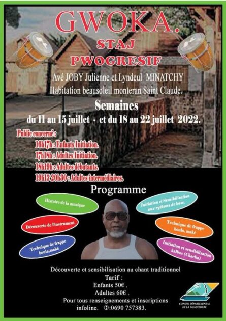 Comme chaque année depuis 1984, le percussionniste Joby Julienne propose des stages d’initiation et de formation aux techniques du gwoka. Une sensibilisation au chant traditionnel est également au programme. Cela se passe à Saint-Claude à l’habitation Beausoleil, avec aussi Lyndeul Minatchy. Le stage se déroule sur deux semaines, du 11 au 22 juillet 2022. Il comprend des sessions pour les enfants et des sessions pour adultes. Les renseignements et inscriptions sont accessibles au 0690 757383. On ne présente plus Joby Julienne qui a fait partie des fondateurs de Van Lévé, l’une des figures du gwoka moderne, a collaboré avec Kassav’, les frères d’Huy ou encore Franck Nicolas parmi de nombreux autres. Il a fait partie d’Iguane Xtet, a joué avec Bérose et monté le groupe K’Koustik avec son complice Jean-Marc Ferdinand. On l’entend actuellement au sein du projet Nayo Konsept de Joël Jernidier.