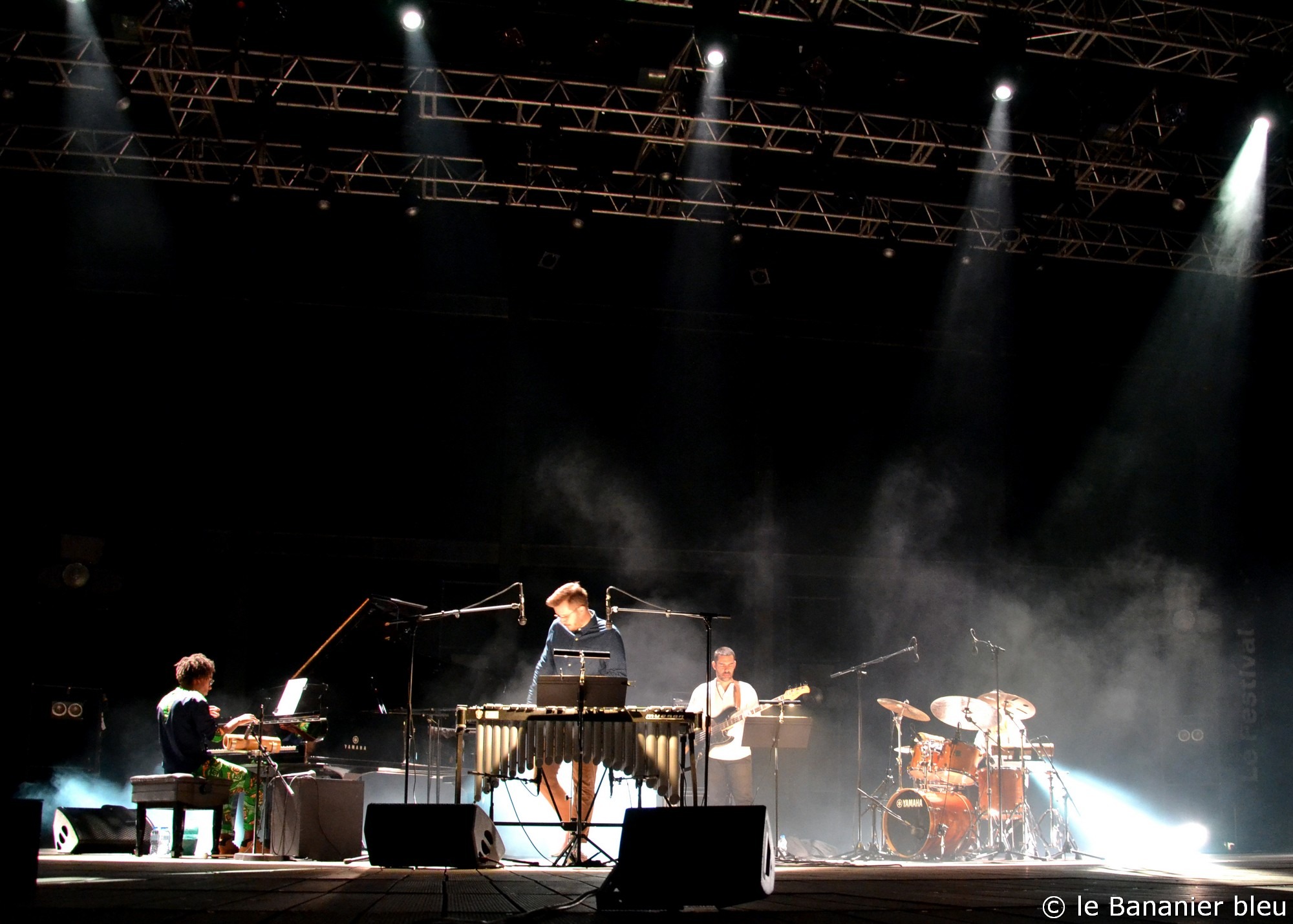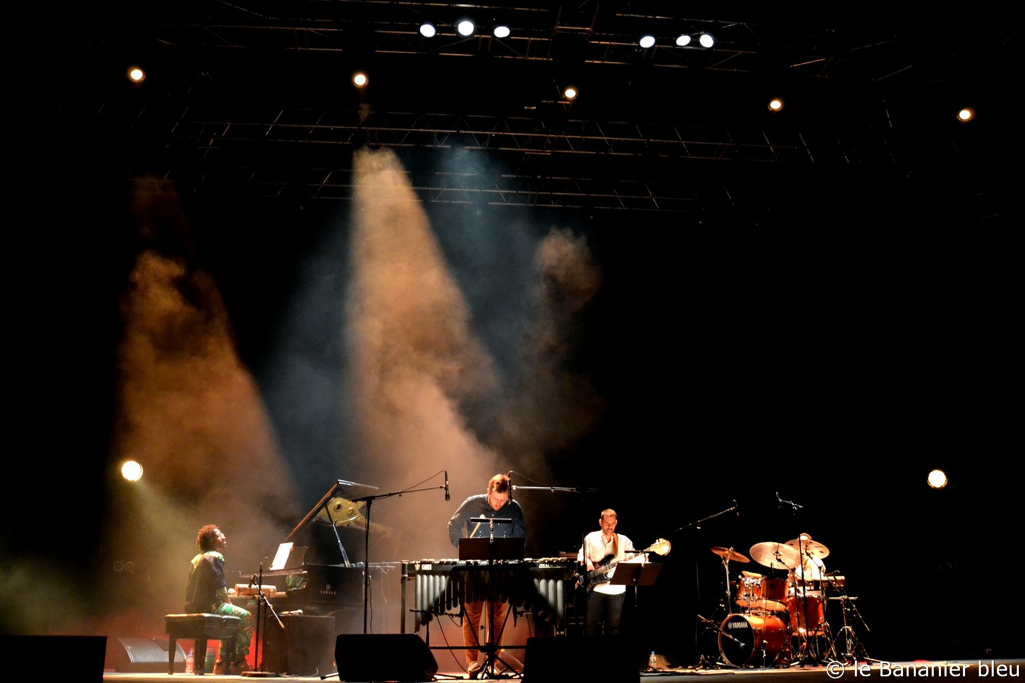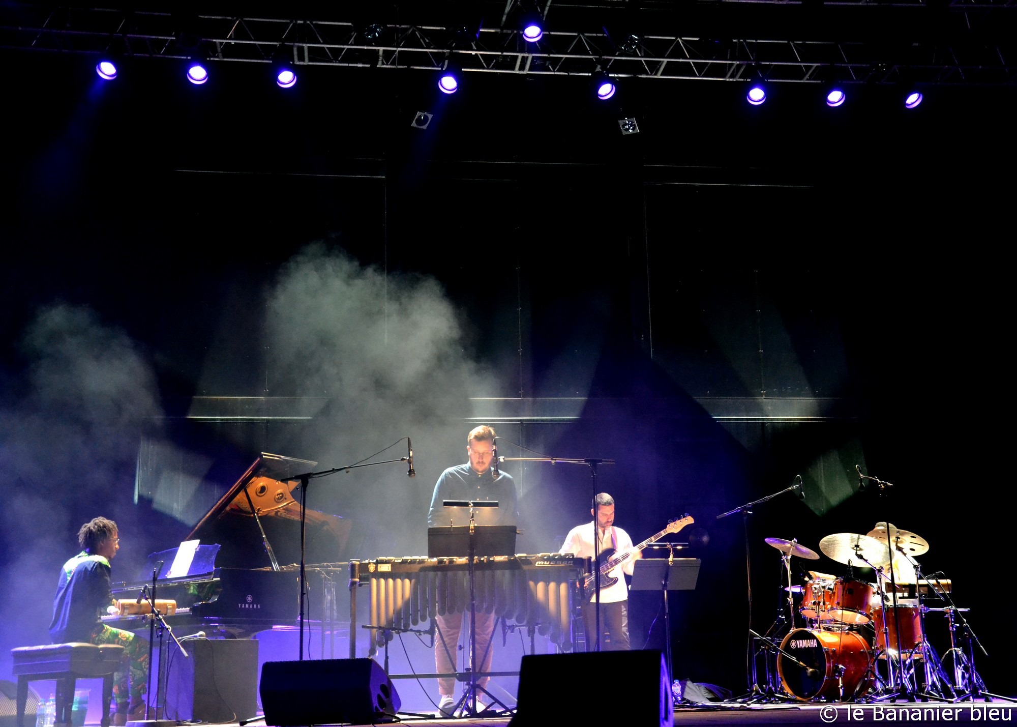 Ce Samedi soir 23 juillet, c’est le pianiste Xavier Belin qui a eu l’honneur de clôturer l’édition 2022 du Festival de Radio France Montpellier. Dans l’amphithéâtre du Domaine d’O, le jeune martiniquais a enchanté le public avec le répertoire de son album Pitakpi dont nous avions déjà dit le plus grand bien lors de sa sortie. Le projet tourne depuis 2018 et cela se sent dans la fluidité de la musique et la complicité entre les musiciens du quartet. Xavier Belin est entouré de complices talentueux, pour la plupart également baignés dans la culture martiniquaise. On a ainsi retrouvé la basse énergique d’Elvin Bironien – dont nous venons de chroniquer l’excellent album Lueurs, tout juste paru, et la batterie étincelante de « Tilo » Bertholo. Le batteur développait ce soir son jeu autour du ti-bwa et nous a promené dans les rythmes de la Caraïbe, avec même parfois des accents de carnaval. Une excellente manière d’illustrer sa grande polyvalence, après le concert de Rodolphe Lauretta sur cette même scène la semaine précédente, où il oscillait entre jazz fusion et duos avec le beat boxing de Napoleon Maddox. Enfin, au vibraphone, le formidable Alexis Valet ne s’en laisse pas compter et fait complètement corps avec le projet, tantôt en nappes qui rappellent Mike Mainieri, autant qu’en chorus inspirés et aussi limpides que brillants. Le leader s’amuse et échange – avec les musiciens comme avec le public – et nous propose une musique exigeante sans être jamais ennuyeuse – tout est là ! – où le rythme reste le maitre mot, et sert de prétexte aux digressions les plus originales. Après Pitakpi, Xavier Belin travaille déjà à son prochain projet, dont les premières notes devraient nous parvenir avant la fin de l’année. On a hâte !
