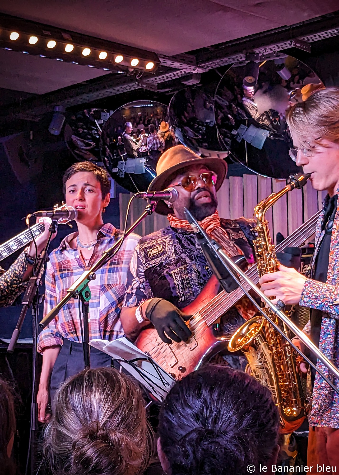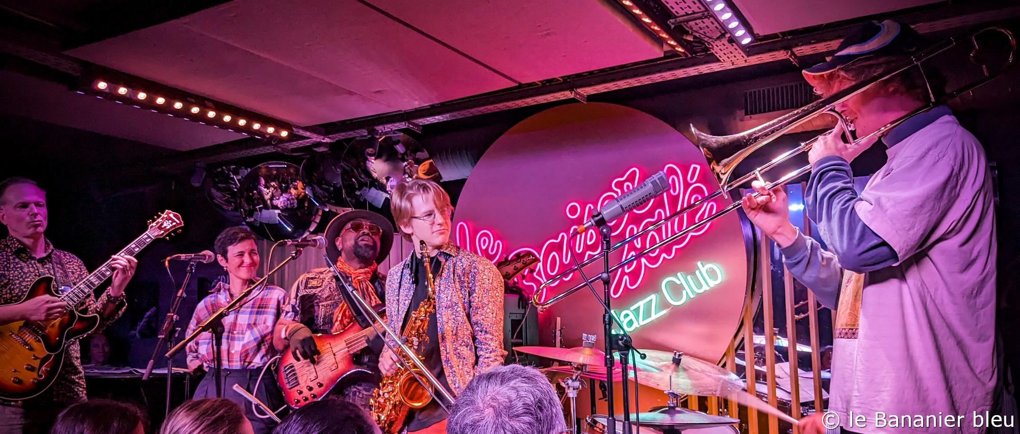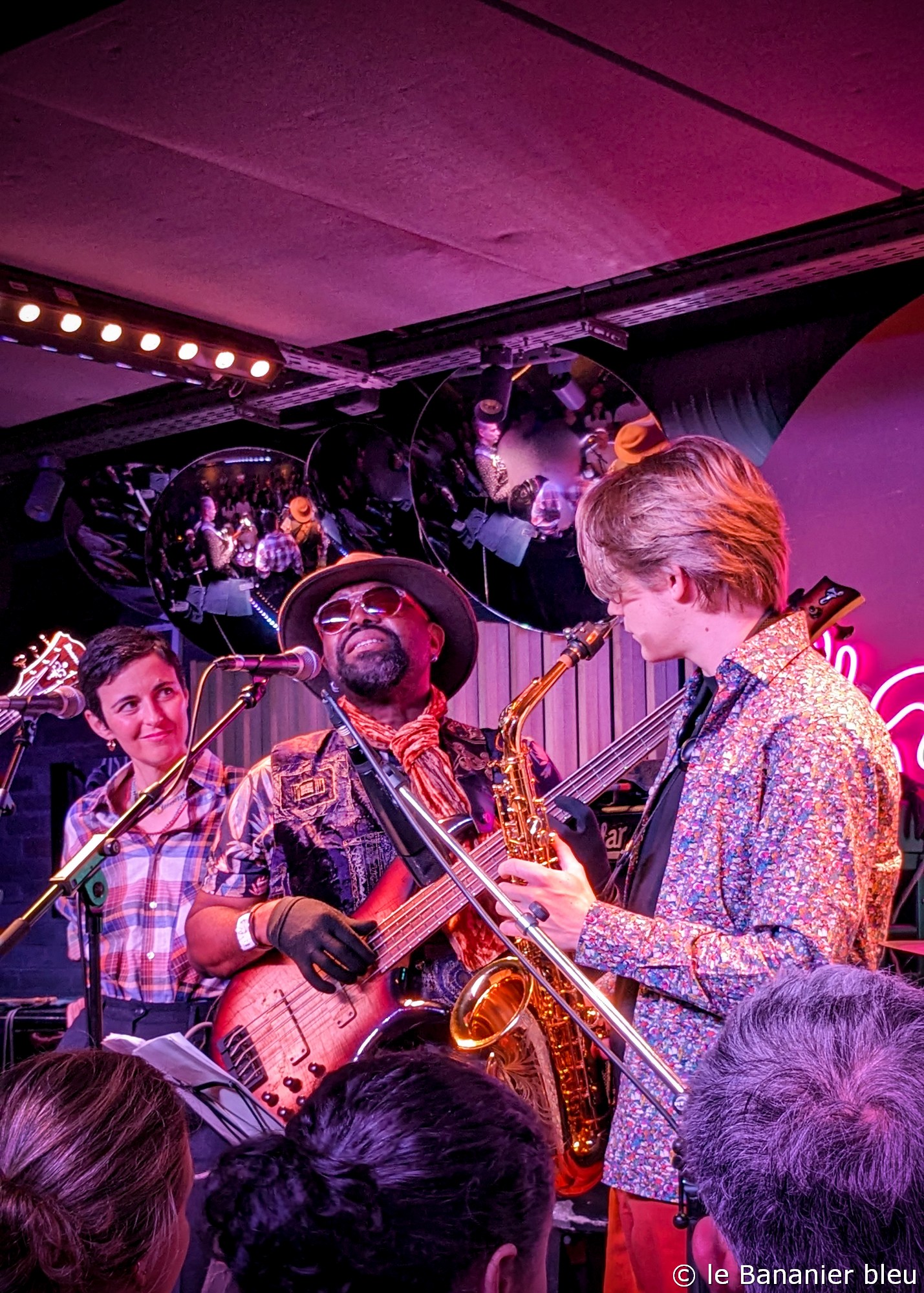 Donc Su La Také est revenu. Etienne a d’abord appelé la patronne, Cate Petit, qui fait partie intégrante de l’identité de Su La Také depuis l’origine, tant par la voix, la danse que par sa complicité. Cédric Baud fait aussi partie des incontournables du projet, quasiment depuis les débuts, et la richesse de son apport musical n’est plus à démontrer. Pour ces deux soirées au Baiser Salé, Etienne a fait monter à l’étage Tiss Rodriguez, pour tenir la batterie. Le batteur “maison” en grande forme, revient tout juste d’une résidence à la Villa Albertine de la Nouvelle Orléans. Et puis, Etienne a aussi le chic pour dénicher les jeunes talents que personne n’a encore entendus. Il y a vingt ans, il propulsait les frères Jim et John Grandcamp, découverts par hasard dans le métro. Cette fois-ci, c’est au CNSM – mais à travers les réseaux sociaux du moment, qu’il a repéré Darius Moglia (sax) et son frère Gaspard (trombone) qui à eux deux ne pèsent même pas quarante ans. Comme chacun sait, la valeur, n’attend pas le nombre des années. Démonstration éclatante.