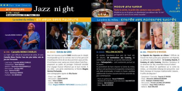 Le Festival Culturel de Fort-de-France, dont c’est la 53e édition cette année, se clôturera le 27 juillet prochain, par sa désormais célèbre Jazz Night. Quatre temps forts pour cette soirée, avec en ouverture, à 19h00, la chanteuse guyanaise Cannelle Mona-Charles, qui sera accompagnée par Eric Bonheur, Dominique Bérose, Dominique Bougrainville, Alain Ravaud, Georges Mac et Patrick Plenet. C’est ensuite Guy-Marc Vadeleux – GMX à la scène – qui proposera son répertoire, avec en invitée, la flutiste colombienne Magela Herrera Portuondo. La deuxième partie de soirée verra les performances de deux géants, avec tout d’abord le concert de la légende Yellowjackets, dont les références que sont Bob Mintzer et Russel Ferrante. Non moins légendaire, c’est Paquito d’Rivera qui clôturera la soirée, accompagné entre autres de la batterie de Mark Walker. Tout cela se passe au Parc Aimé Césaire.