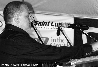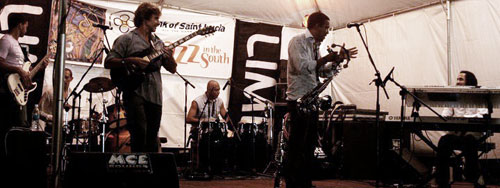 Le deuxième soir du festival se déroulait dans l’enceinte du Coconut Bay Beach Resort. Superbe cadre dans un parc soigné à l’anglaise. C’est peut-être aussi le seul léger accroc du Festival – en tous cas un des rares points à probablement repenser pour les prochaines éditions : avec ce cadre trop isolé et probablement un peu intimidant, le festival n’a pas su ici attirer en masse les spectateurs de Vieux Fort ou Laborie. C’est un peu dommage, même si un parterre d’inconditionnels et de connaisseurs avait fait le déplacement, parfois depuis Castries, pour assister aux concerts. C’est la pianiste Rhea Drakes, de Barbade, qui ouvre la soirée avec son trio. Elle est suivie par le quintet des frères Mushy et Joël Widmaier. Ils présentent un répertoire basé sur les deux albums de Mushy, Koté Ou (1996) et My World (2005), dans le contexte particulier de l’après 12 janvier. Du coup, la musique transmet une émotion palpable. A la trompette, Jean Caze, deuxième au prestigieux concours international Thelonious Monk en 2007 donne un éclat particulier à la musique tout en synthèse de Mushy, dans laquelle se mêlent la Caraïbe, le rock, le jazz et parfois la musique moderne du XXe siècle – il est actuellement en pleine période Dutilleux ! Pour clore le show, Thurgot Théodat monte sur scène avec conque et saxophone, soulevant instantanément l’assistance qui se retrouve dans cette fusion éminemment caribéenne. |