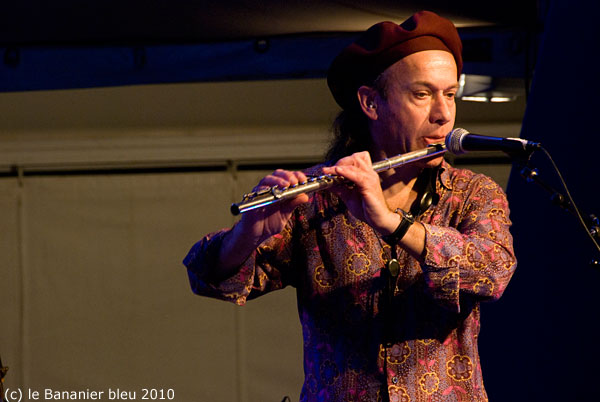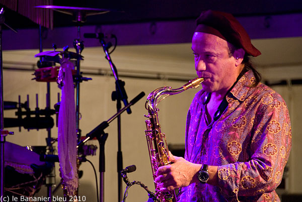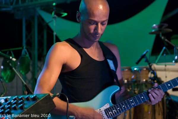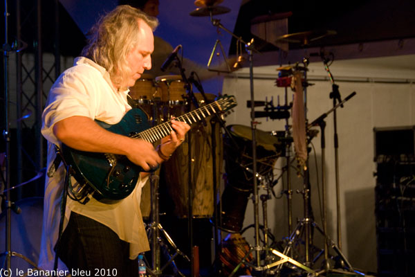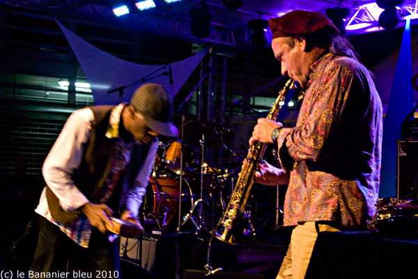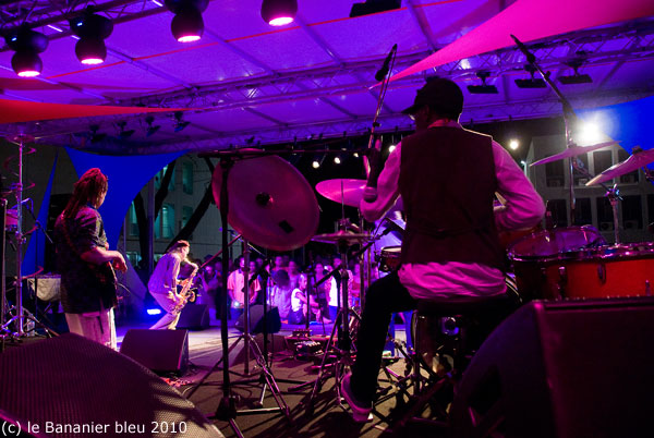 C’est Sixun qui clôturait la soirée, en forme d’apothéose. A peine assis derrière ses fûts, Paco Séry, fraichement débarqué de l’avion posait d’emblée le niveau du débat. Haut. Voire très haut, et les cinq autres n’avaient qu’à suivre ! Michel Alibo, très applaudi en tant qu’enfant du pays – ou presque – canalisait l’attention. Sixun a toujours eu une place variable, celle du percussionniste. Allez savoir pourquoi ? Toujours est-il que c’est Zé Luis Nascimento qui tenait la place avec un plaisir visible – et partagé. Sur essentiellement le répertoire de Palabre, leur dernier CD studio, Jean-Pierre Como, Louis Winsberg et Alain Debiossat s’en sont donné à cœur joie – voir la version haute en couleurs d’Essaouira. En ambianceur patenté, Paco Séry, à la sanza, entrainait ses collègues et la foule dans des battles mémorables. On regrettera simplement la courte durée du concert, ayant été bizarrement amputé de rappels qui n’attendaient pourtant que cela !