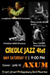 Truly a creole jazz love call with 2 very special guests! The one and only Longineu Parsons (trumpet) from USA, and Max Fontes (acoustic bass) from Guadeloupe. With a young lion, Kirby Louis-Jeune (drums) and truly yours, Christian Amour piano. Be there peeps, on May 17 at Axum the cozy spot for jazz !