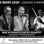 MAX & FRANCIS FONTES QUARTET Special guest: Xav RICHARD’O (Saxophone) Max FONTES (Contrebasse) – Francis FONTES (Piano) Jocelyn MÉNARD (Saxophone) – Raymond GRÉGO (Batterie) (Participation 7€ pour la clientèle qui dîne – 14€ lorsqu’on prend bar-tapas & boire un verre)